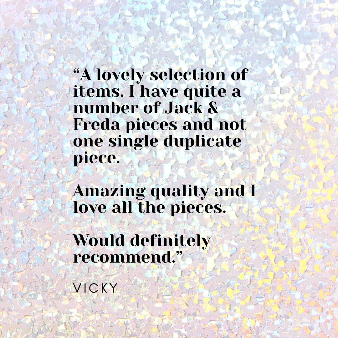 A lovely selection of items. A couple of pieces I have gifted to family . I have quite a number of Jack and Freda pieces and not one single duplicate piece. Amazing quality and I love all the pieces . Would definitely recommend